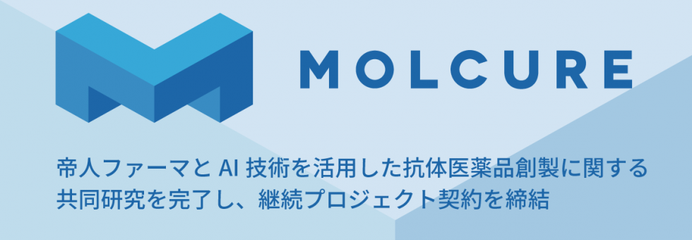 株式会社MOLCURE(本社:神奈川県川崎市、代表取締役CEO兼CSO:玉木 聡志、以下「MOLCURE」)は、帝人ファーマ株式会社(本社:東京都千代田区、代表取締役社長:種田 正樹、以下「帝人ファーマ」)と、当社のAI創薬プラットフォーム技術を活用した中枢疾患標的に対する革新的な抗体医薬品の創製を目的とした共同研究契約(https://prtimes.jp/main/html/rd/p/000000009.000083912.html)に基づく最初のプロジェクトを完了しました。この成果を受け、帝人ファーマとMOLCUREは継続プロジェクトの契約を締結するとともに、更なる契約拡大に向けた協議も進めています。